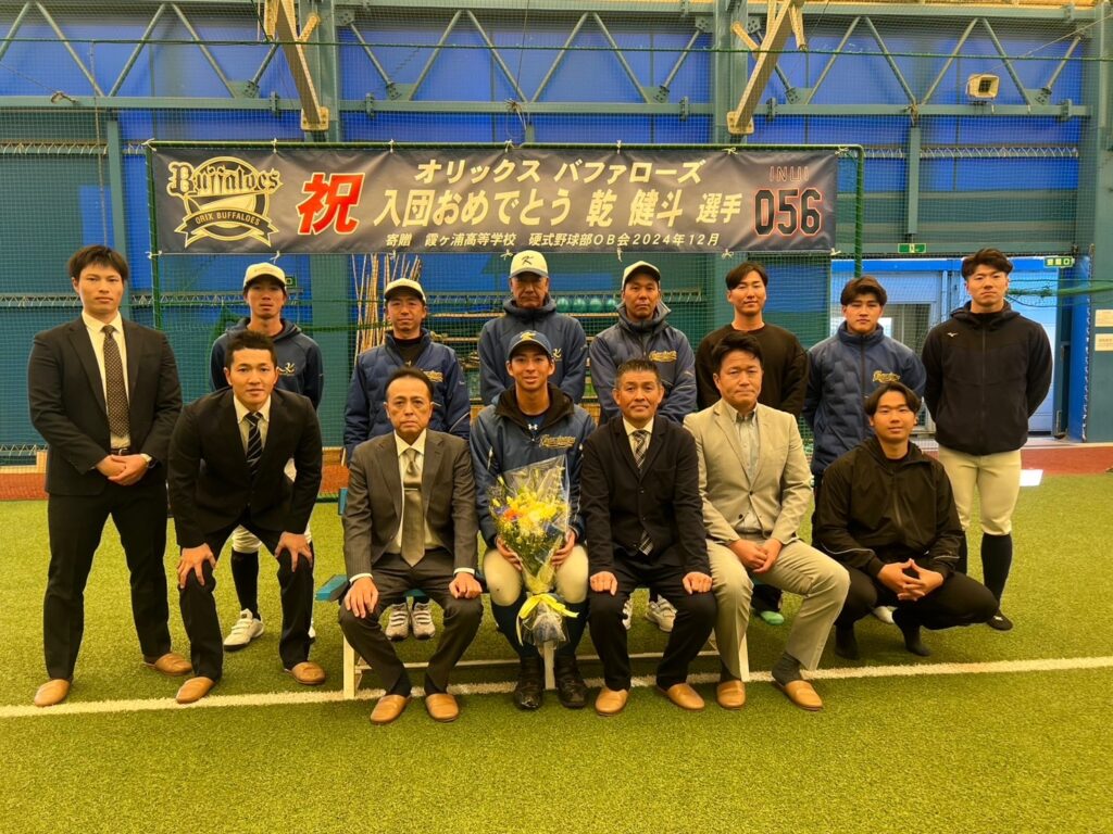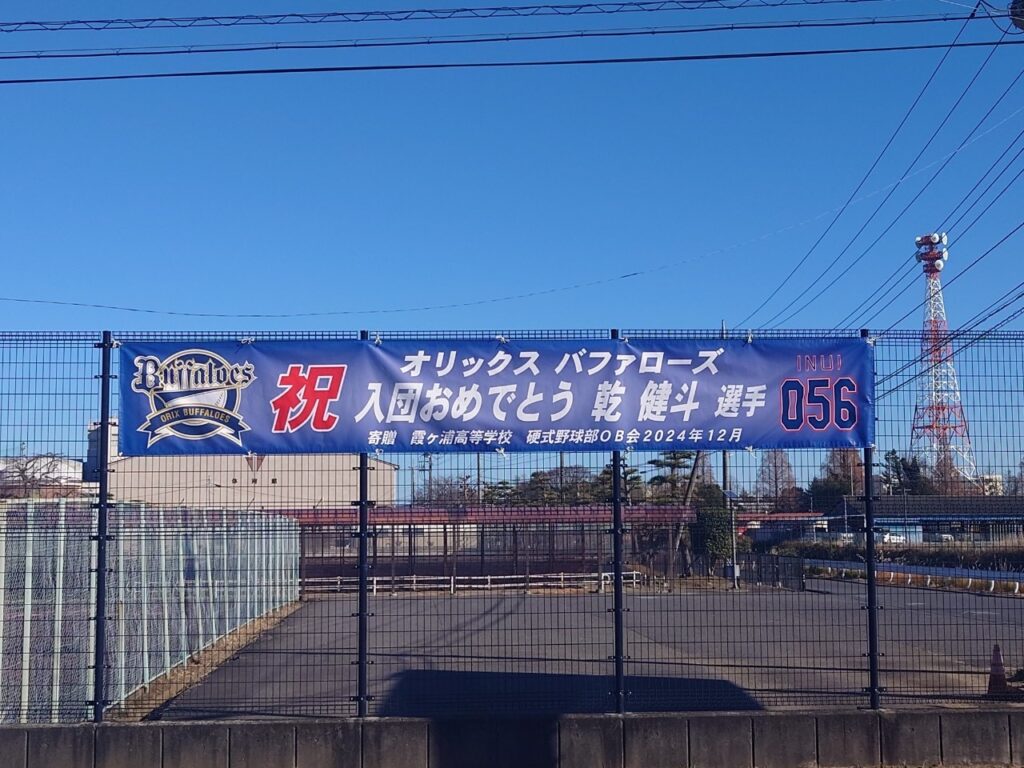 髙橋監督からは感謝の気持ちを忘れず努力を惜しまず頑張ってもらいたいと激励の言葉を頂き、乾選手からは支配下目指して頑張りますと力強い言葉をもらいました。OB会からは横断幕を寄贈し、卒業式まで125線沿いのフェンスに飾らしてもらいました。霞ヶ浦高校硬式野球部で教えてもらった事を活かして活躍する事を願っております。引き続きOB皆様の応援のほど宜しくお願いいたします。