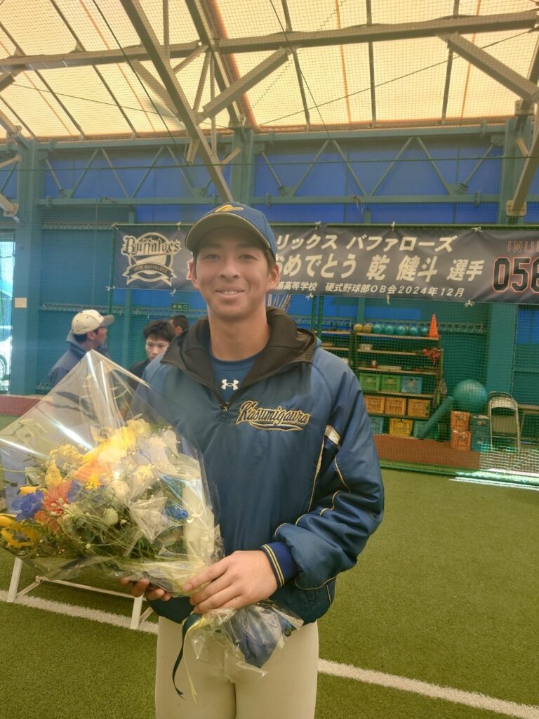 12/28(土)にオリックスバファローズから育成6位でドラフト指名された乾健斗選手の入団激励会を室内練習場で行いました。我校硬式野球部から10人目のプロ野球選手の誕生に大変嬉しく思っております。