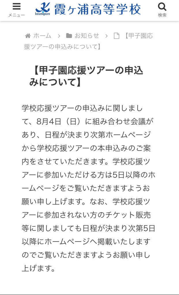 明日以降、霞ヶ浦高校のホームページに【甲子園応援ツアー】の申し込みの案内が掲載されます。また、ツアーには参加しないがチケット等の購入に関する連絡も掲載されますので、OBの皆様で応援に行かれます方々がいらっしゃいましたらご確認をお願いいたします。甲子園で校歌を歌えるように県大会同様沢山の応援をして頂けると幸いです。