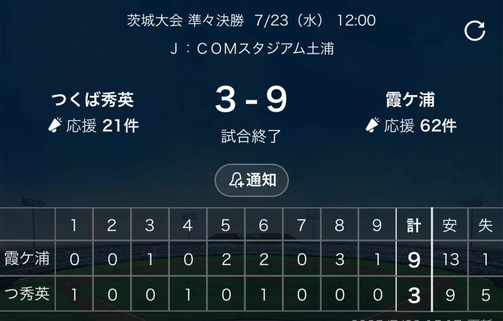 本日行われました準々決勝つくば秀英戦は昨秋のリベンジを果たし9-3で見事勝利を収めることができました。本日も暑い中沢山の応援ありがとうございました。準決勝は7/25(金)に明秀日立と対戦いたします。今春のリベンジをするためにも是非OB皆様の応援で後押しできるように引き続きよろしくお願いいたします。