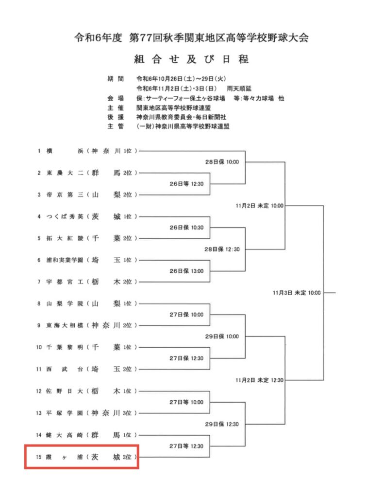 本日、関東大会の抽選会があり組合せが決定しました。初戦の相手は群馬県代表健大高崎高校に決定しました。先ずは初戦突破を目指して、チーム一丸となって戦い、35年ぶりのセンバツ大会を目指してもらいたいと思います。OBの皆様も是非球場にお越し頂きチームを後押ししてもらえたら幸いです。宜しくお願いいたします。組合せは下記の通りになります。